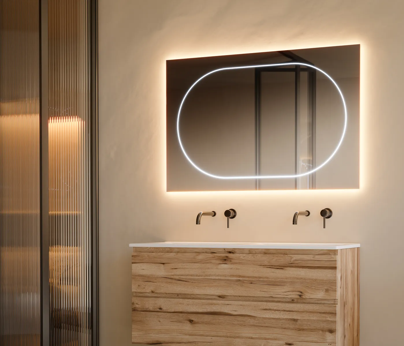 Espejo modelo led frontal + ambiental rectangular con estría en cápsula.