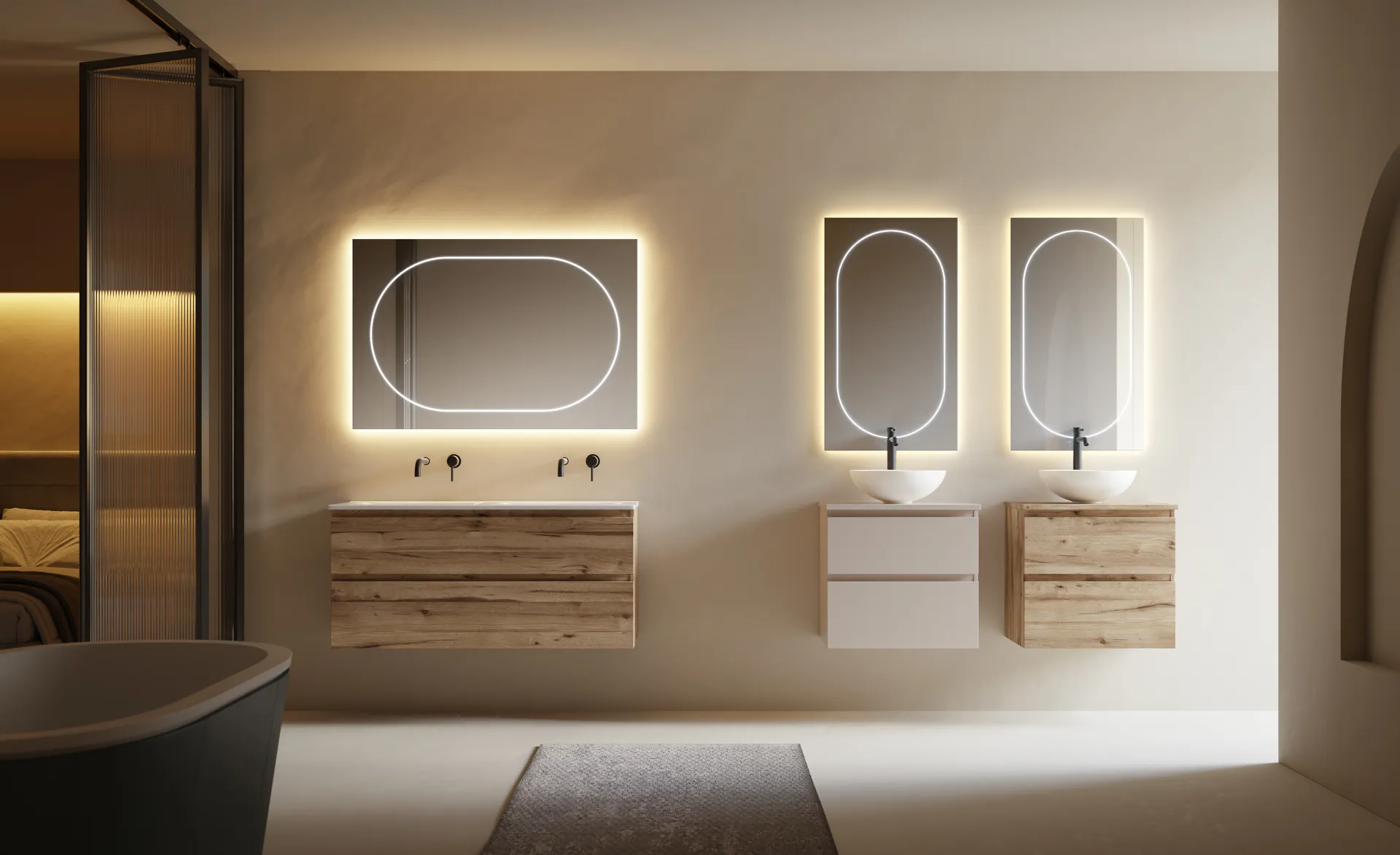 Elige las medidas que necesitas, el grosor y color del vidrio, el tipo de iluminación LED y los sensores que mejor se adaptan a tu espacio. Creamos piezas únicas según tus preferencias.